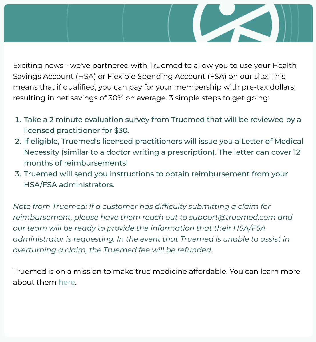 Exciting news! We’ve partnered with @truemedpayments to allow you to use your Health Savings Account (HSA) or Flexible Savings Account (FSA) to reimburse your [Merchant Name] membership, if eligible!